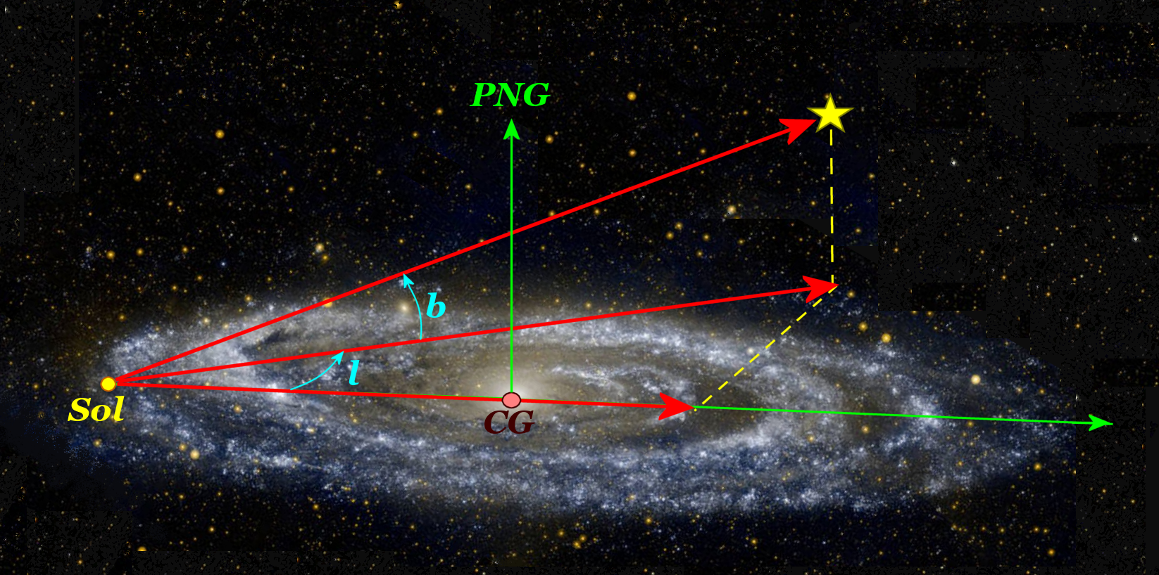 - Es el ángulo que forma la dirección del Sol con el centro de la galaxia y la proyección del objeto sobre dicho plano.