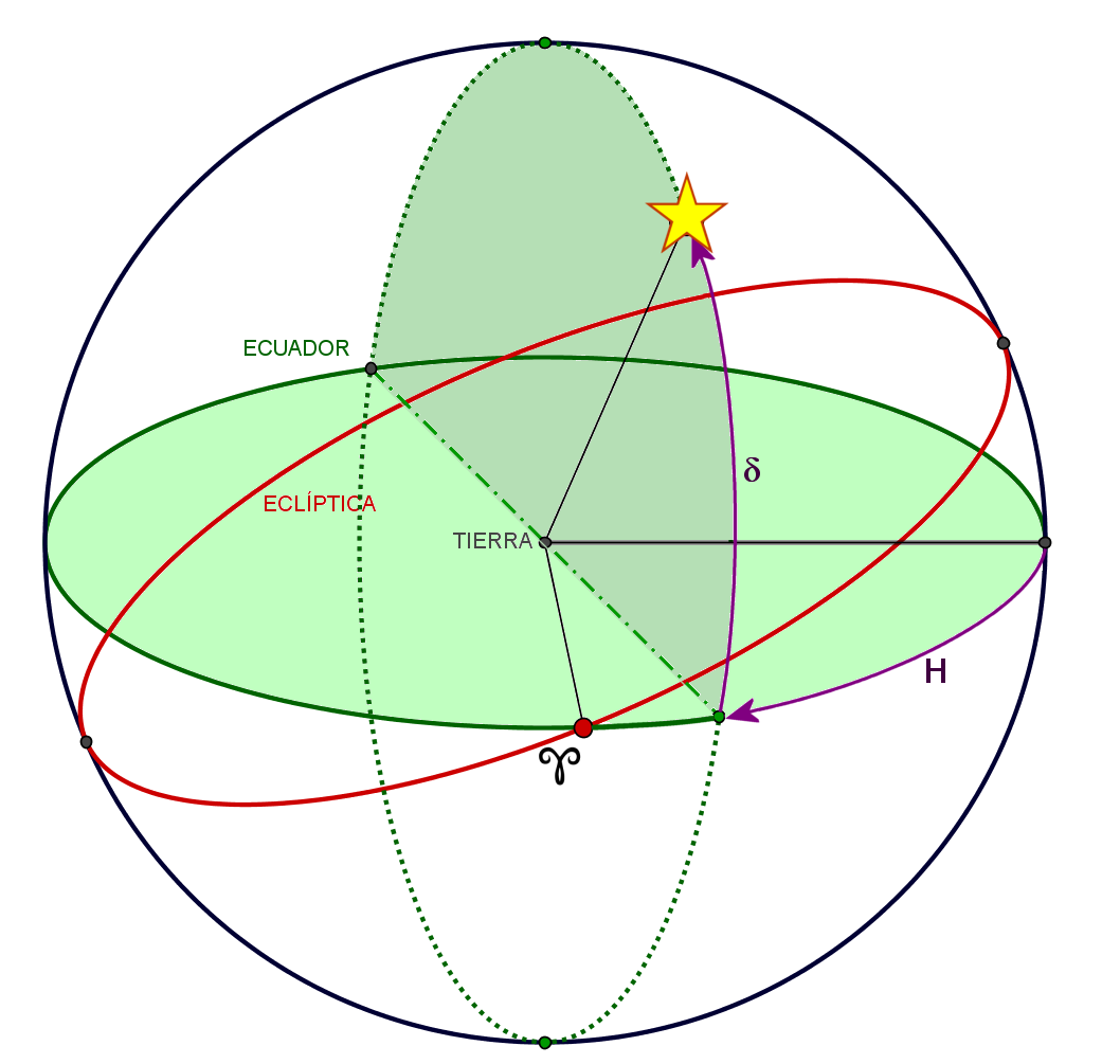 - Arco entre el punto de Aries y la proyección del objeto sobre la eclíptica.