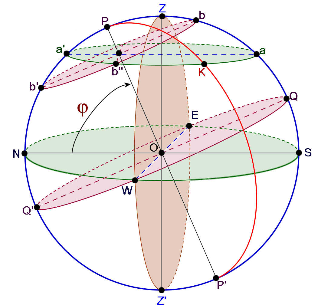 Latitud del lugar φ es el ángulo formado por la meridiana y el eje del mundo. Su complementario (Φ = 90°-φ) se denomina colatitud.