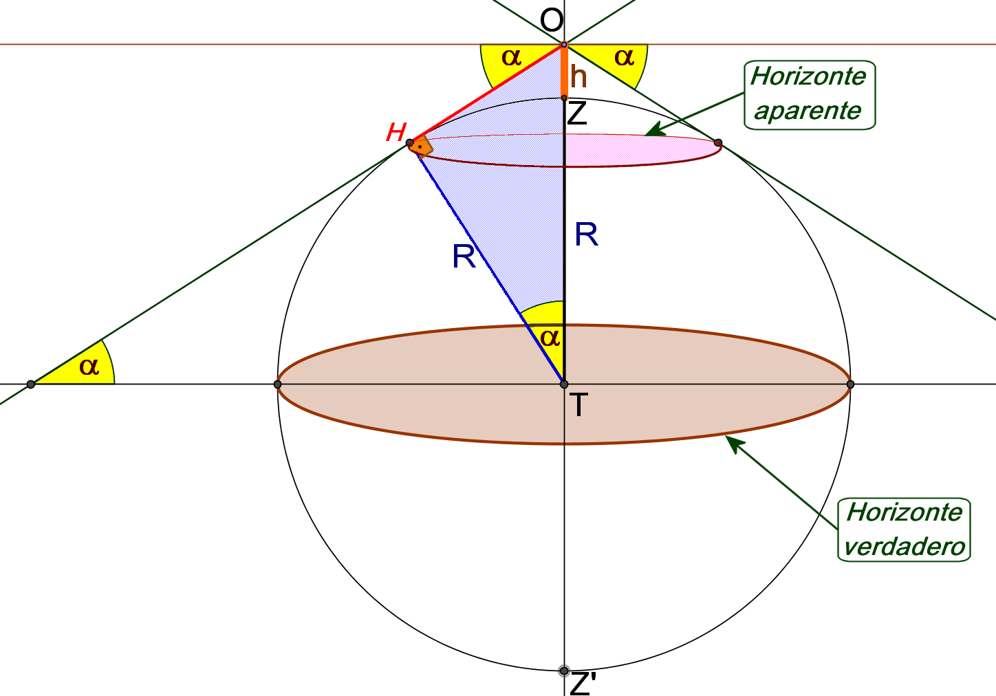 Consideremos un PUNTO DE OBSERVACIÓN, O situado sobre el punto Z a una altura h sobre el nivel del mar. Esta altura es despreciable con respecto a las dimensiones terrestres, y en particular con respecto al radio R.