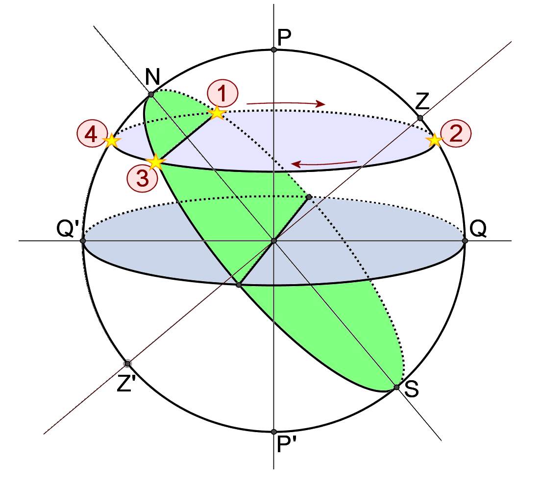 La estrella comenzará a ser visible en el punto 1, ORTO. Recorrerá el paralelo en sentido ESTE a OESTE hasta alcanzar el punto 2, CULMINACIÓN SUPERIOR. Seguirá su trayectoria hasta el punto 3, OCASO; llegará al punto 4, CULMINACIÓN INFERIOR hasta alcanzar de nuevo el punto 1.