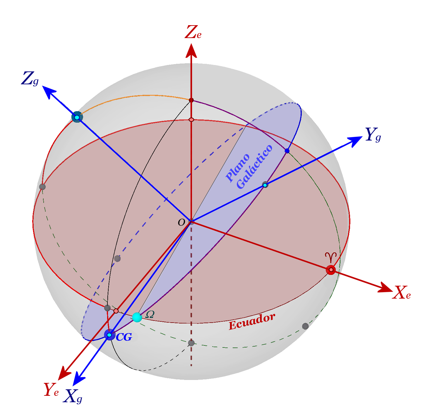 Se muestran los ejes galácticos (azul) superpuestos a los ecuatoriales (rojo).