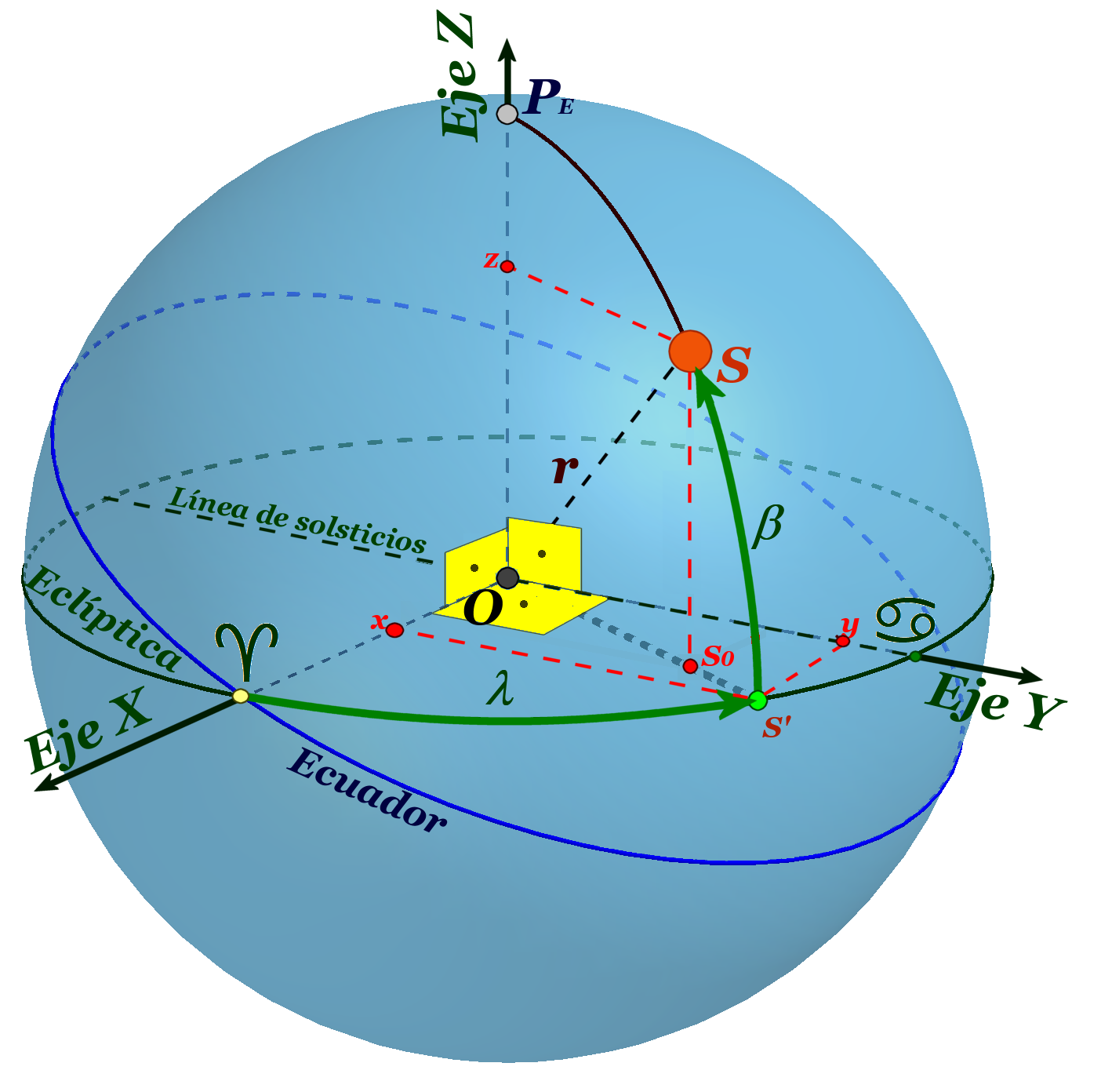- EJE Z: Dirección del eje de la eclíptica y positivo hacia el polo norte eclíptico